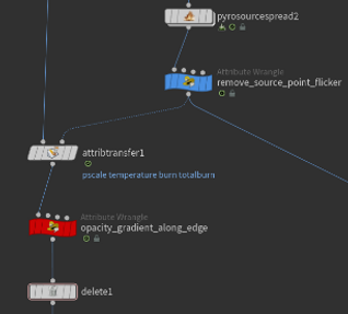 After the Pyro Source Spread, I also include a Point Wrangle to eliminate any potential flickering at the source points. I am pulling the particle’s source points based off of the totalburn attribute, which I will explain more later, so I used the same attribute here. If the source points had already burned for the set amount of time, this removes the possibility of them continuing to fluctuate in temperature. The code for that is below.
