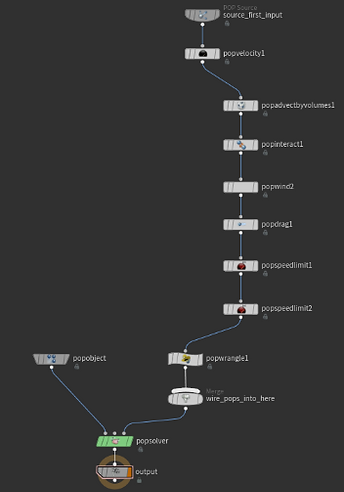 To actually create the particles now, I create another SOP network starting with the disintegration source points created earlier. Here are what each node is doing to the particles within the popnet: